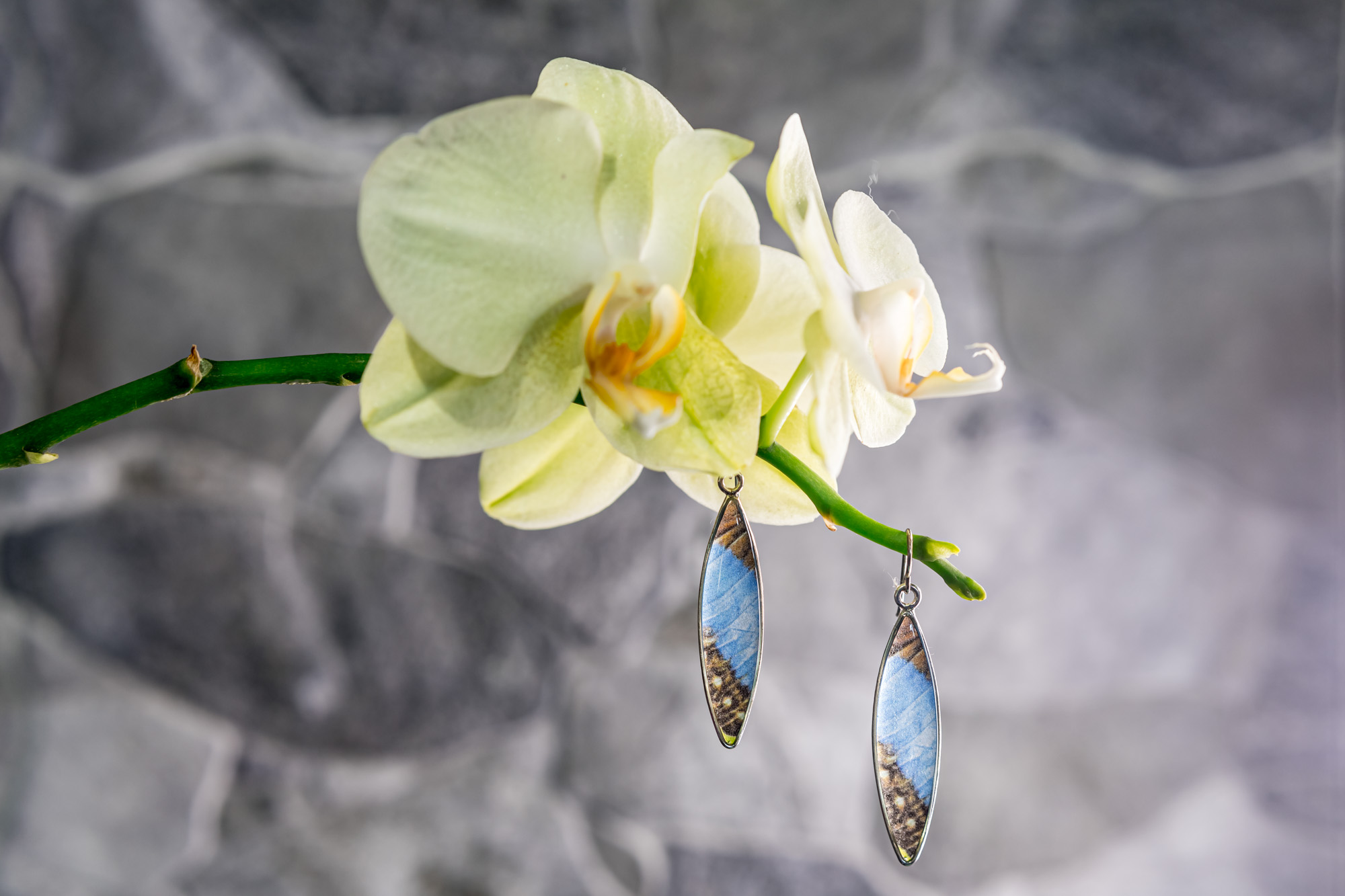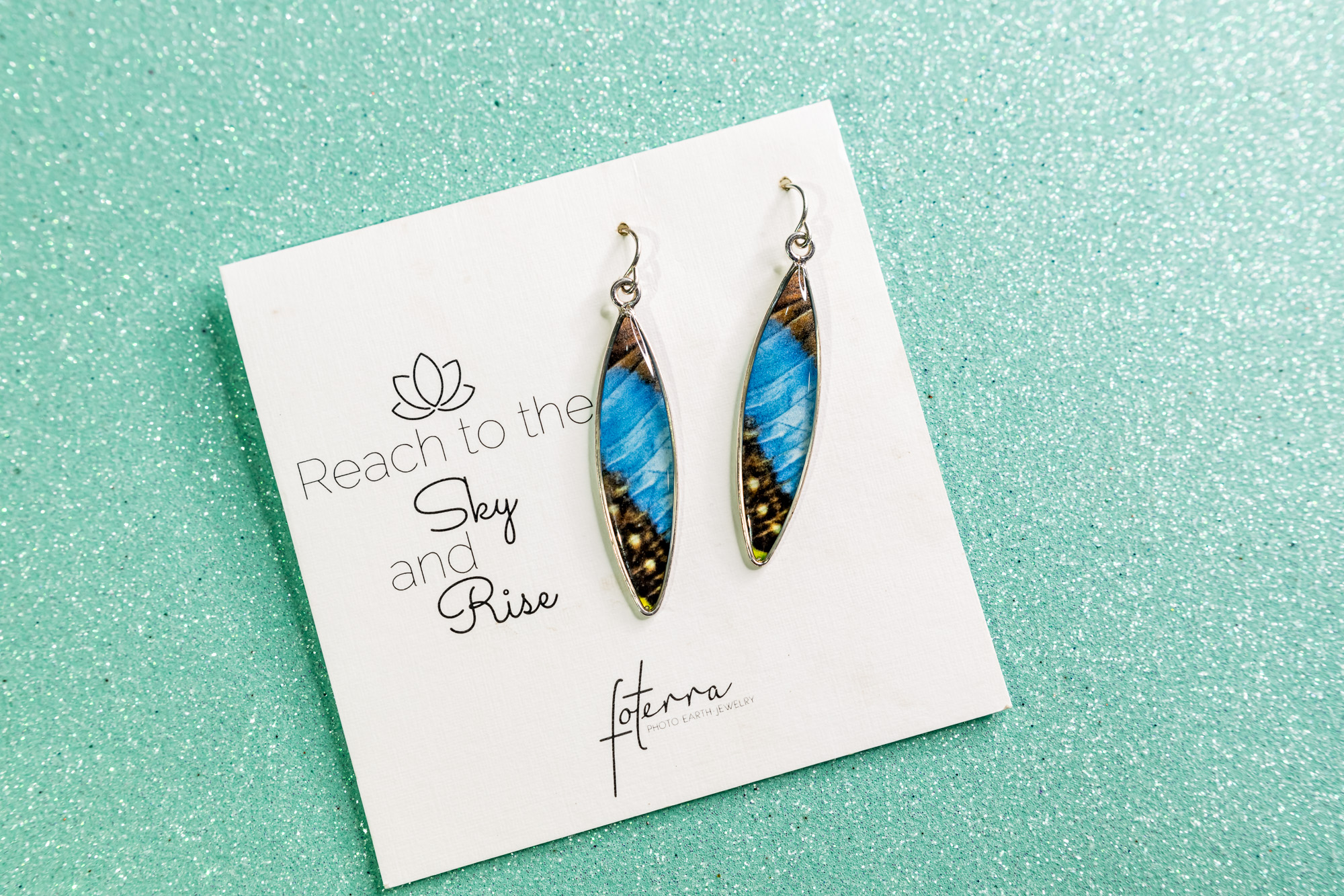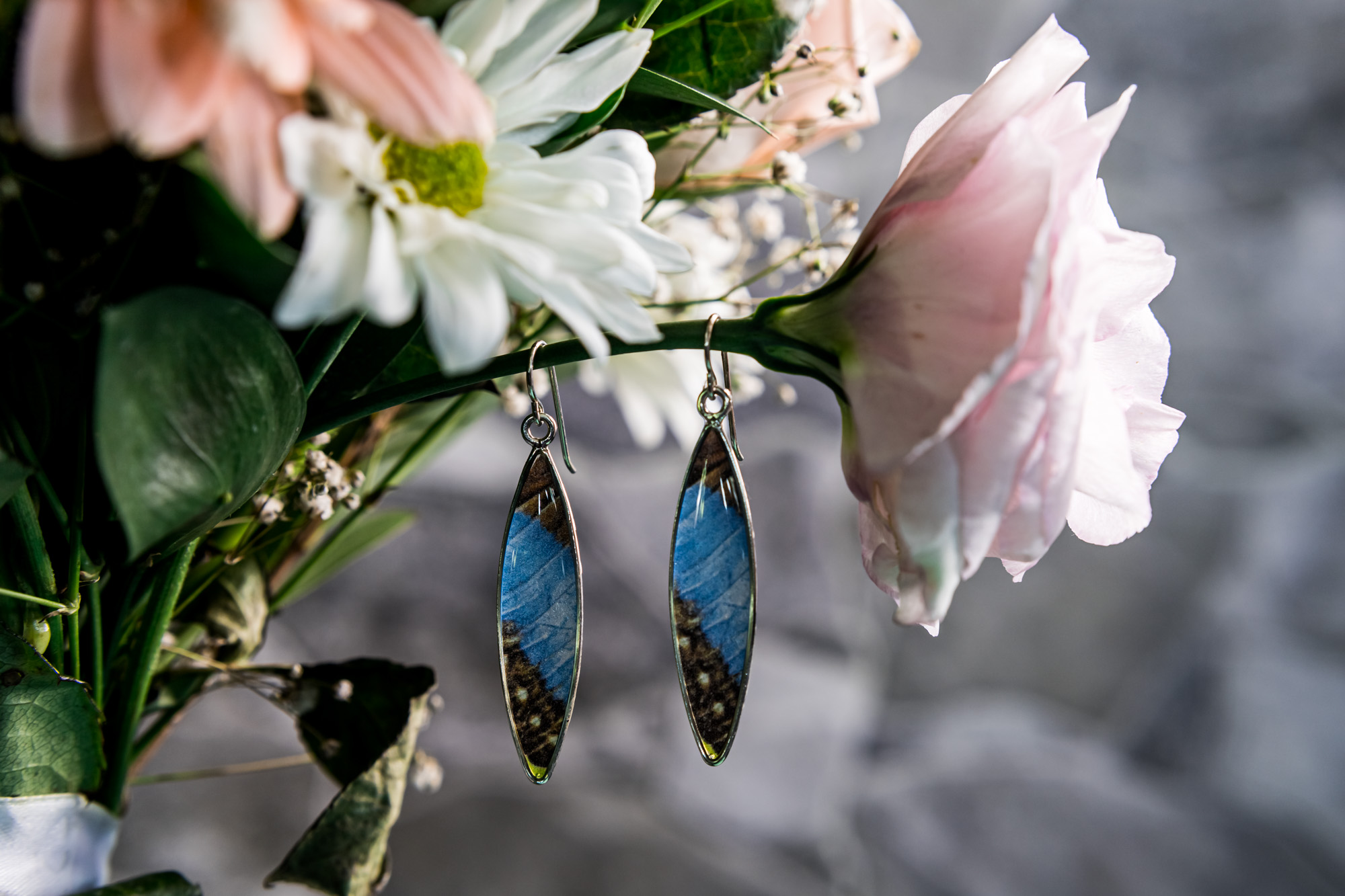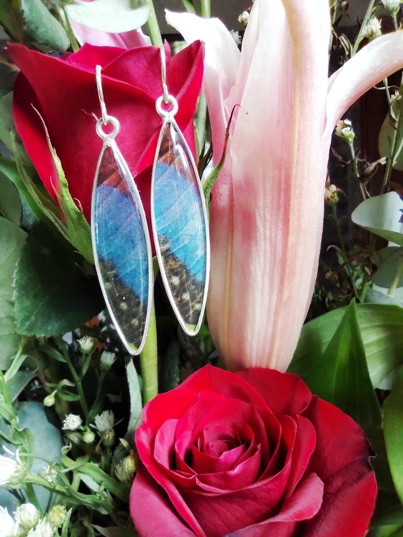 These stunning blue morpho butterfly earrings are made from your choice of .925 sterling silver or 14k gold wire. The photo is securely encased in high-quality resin that protects the photo from humidity, rain, etc. The waterproof resin ensures you can wear these earrings in all weather and the materials are so light you’ll barely notice you’re wearing them.