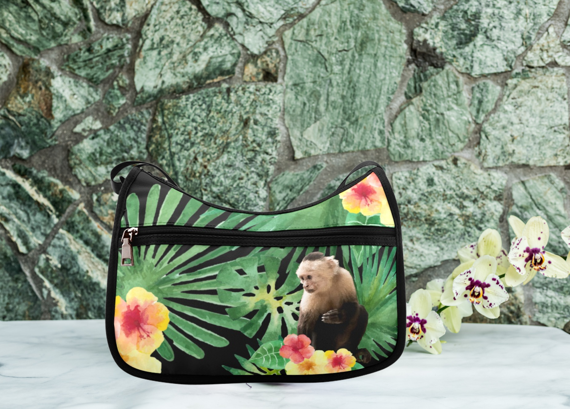 Keep your essentials close at hand in this white-faced monkey handbag made in a super handy crossbody messenger bag style. Big enough to haul your everyday items, yet small enough that it is handy and easy to carry around. As far as purses go, I’m a big fan!